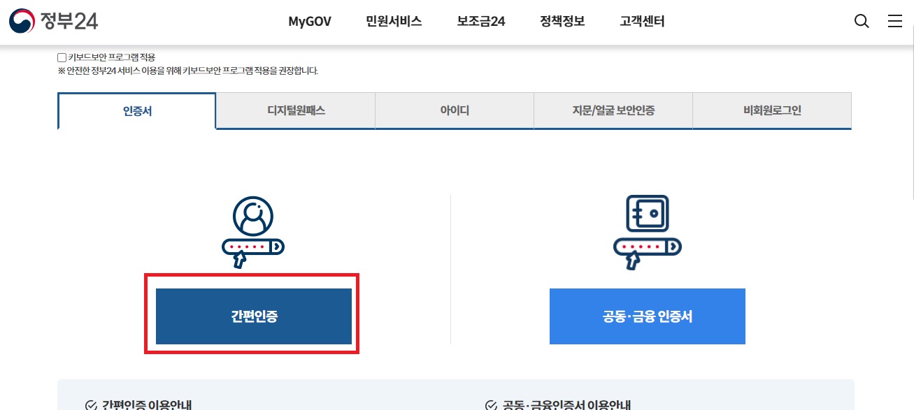 2. 정부24 홈페이지 로그인을 합니다 (회원/비회원 -> 간편인증 또는 본인인증)