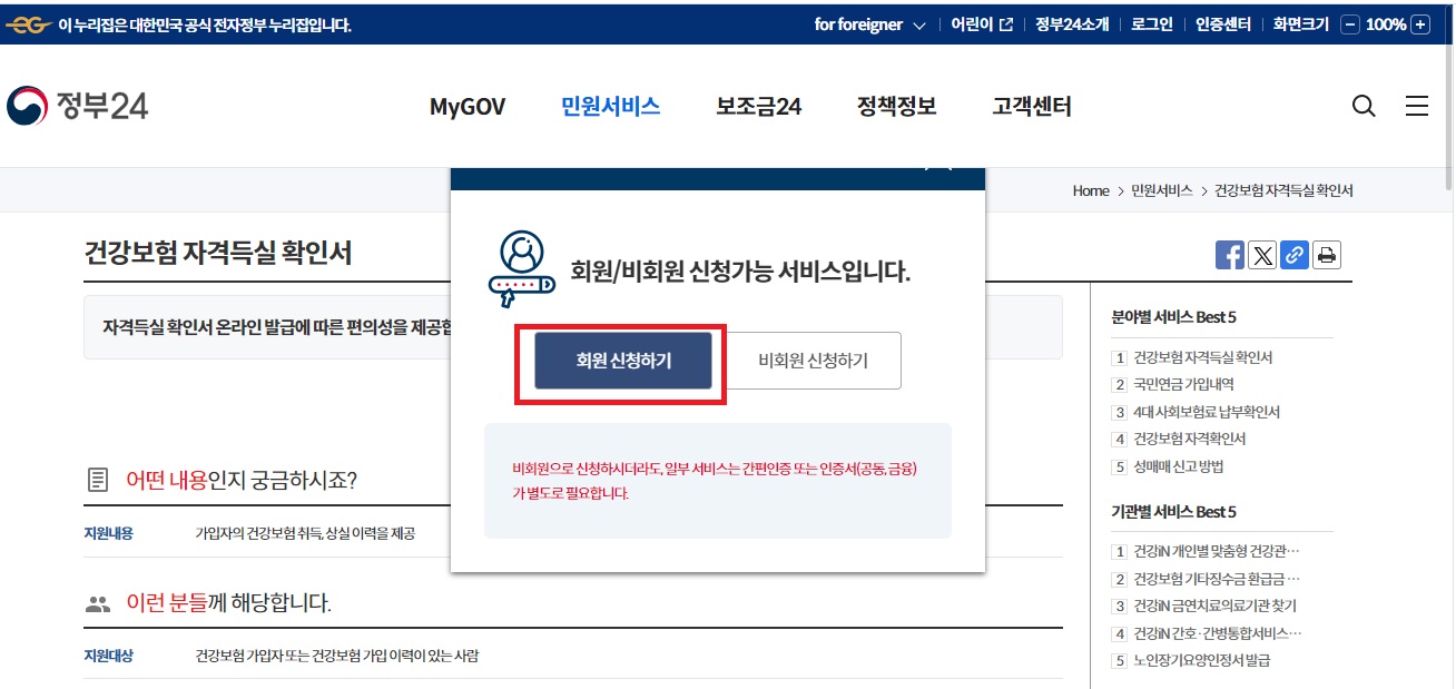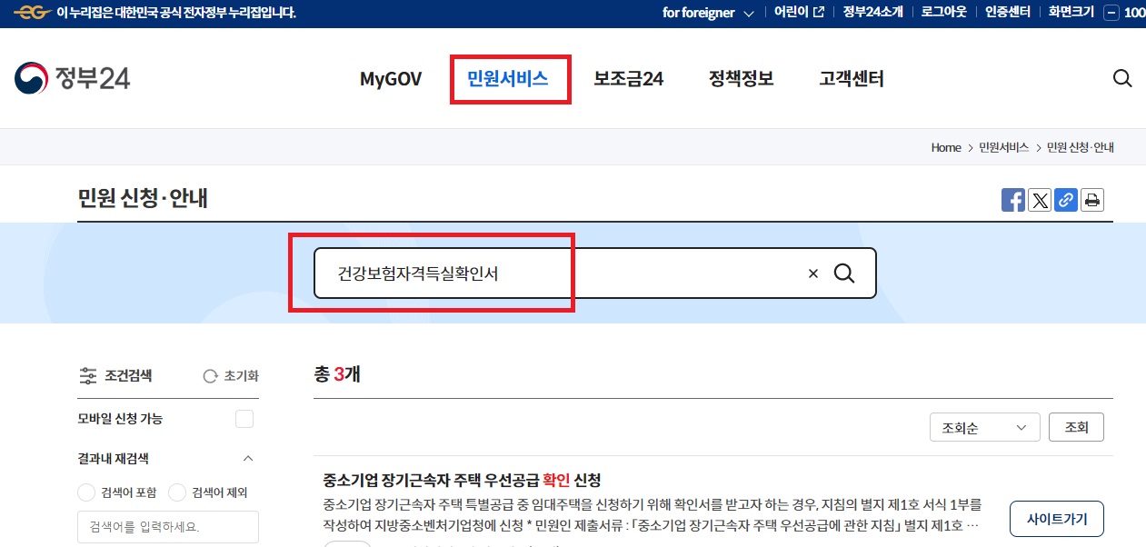 정부24 민원 페이지를 통한 건강보험 자격득실 확인서 발급방법은 아래와 같습니다.