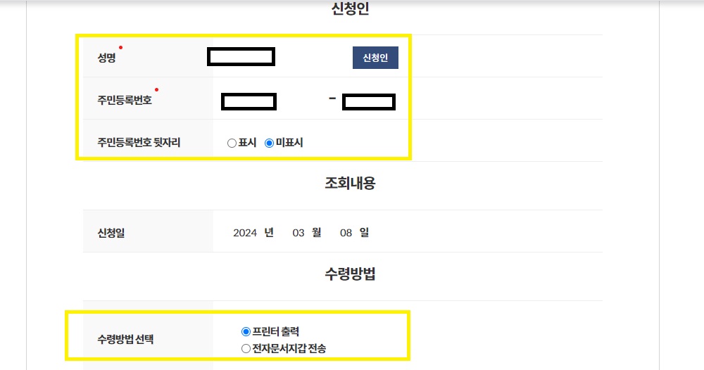 3. 민원신청 진행 (신청인 확인, 수령방법 선택)