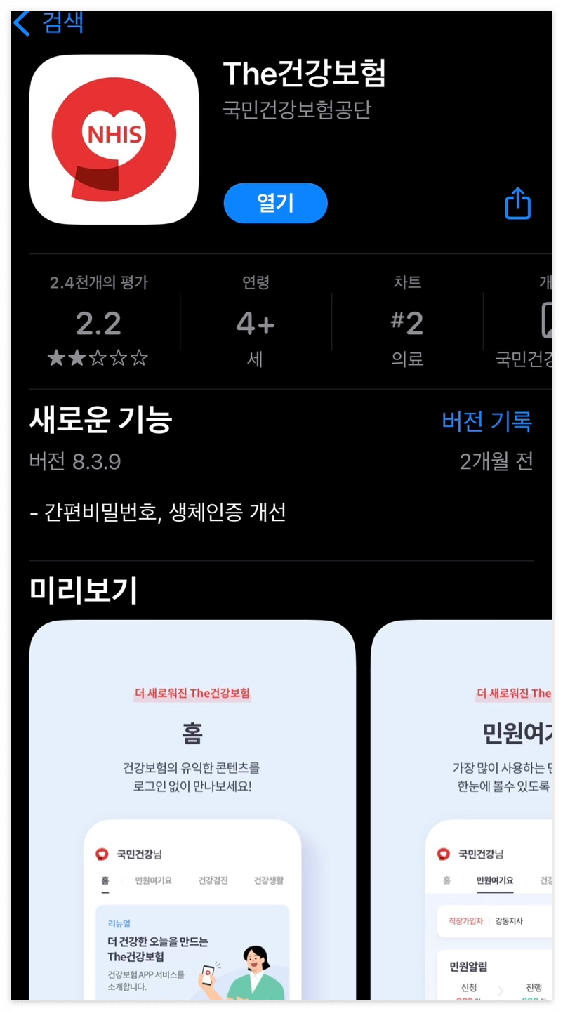 'The건강보험' 이라는 국민건강보험공단의 모바일 어플을 다운받습니다.