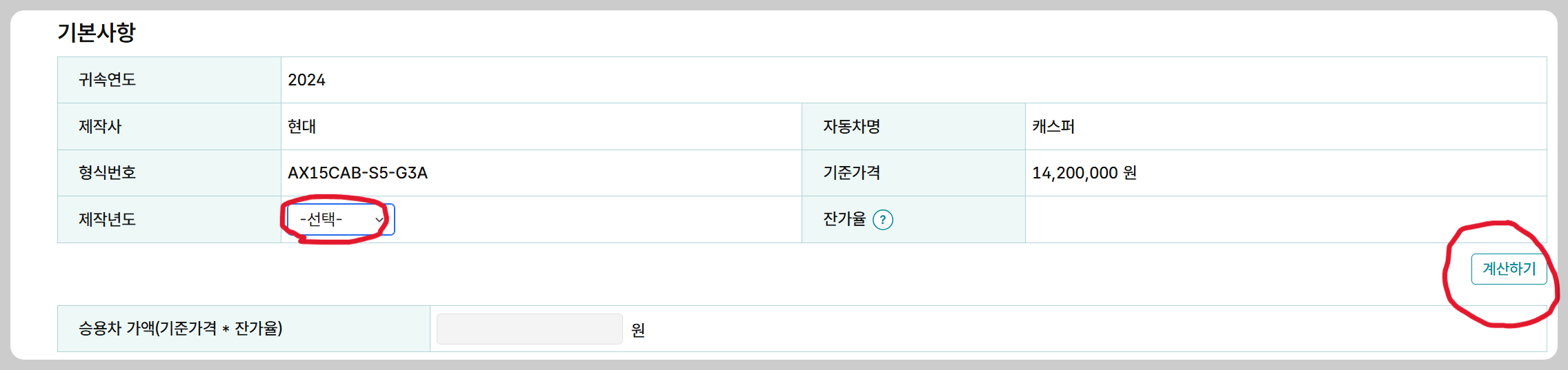[제작년도] 선택 후 [계산하기] 클릭