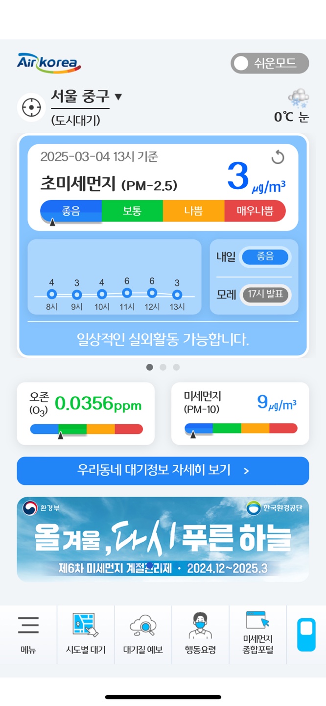 스마트폰 어플 스토어에 '우리농네대기질' 이라는 어플을 다운받으면 실시간 대기정보 확인 가능합니다.